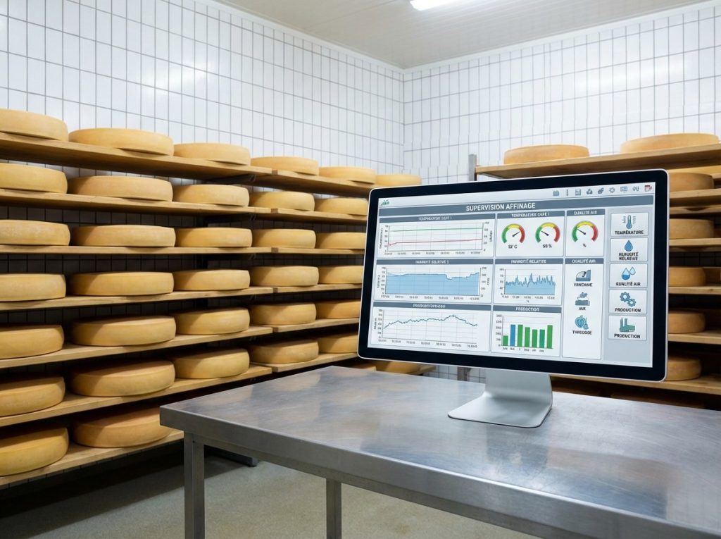 Installation d'un système de supervision et régulation pour caves d'affinage : capteurs température/hygrométrie 4-20mA, automate Schneider M241, variateurs pour ventilation, interface tactile et supervision. Programmation des cycles d'affinage automatiques et gestion des alarmes.