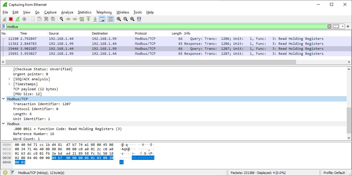 Requêtes Modbus TCP/IP analysées avec Wireshark